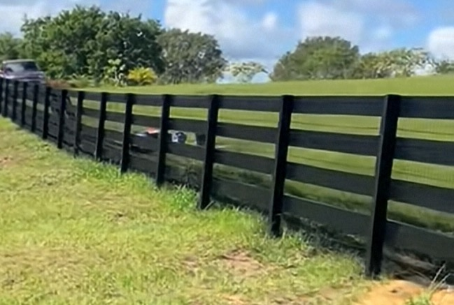 Black and white fence with pointed tops, bolted to cross beams.